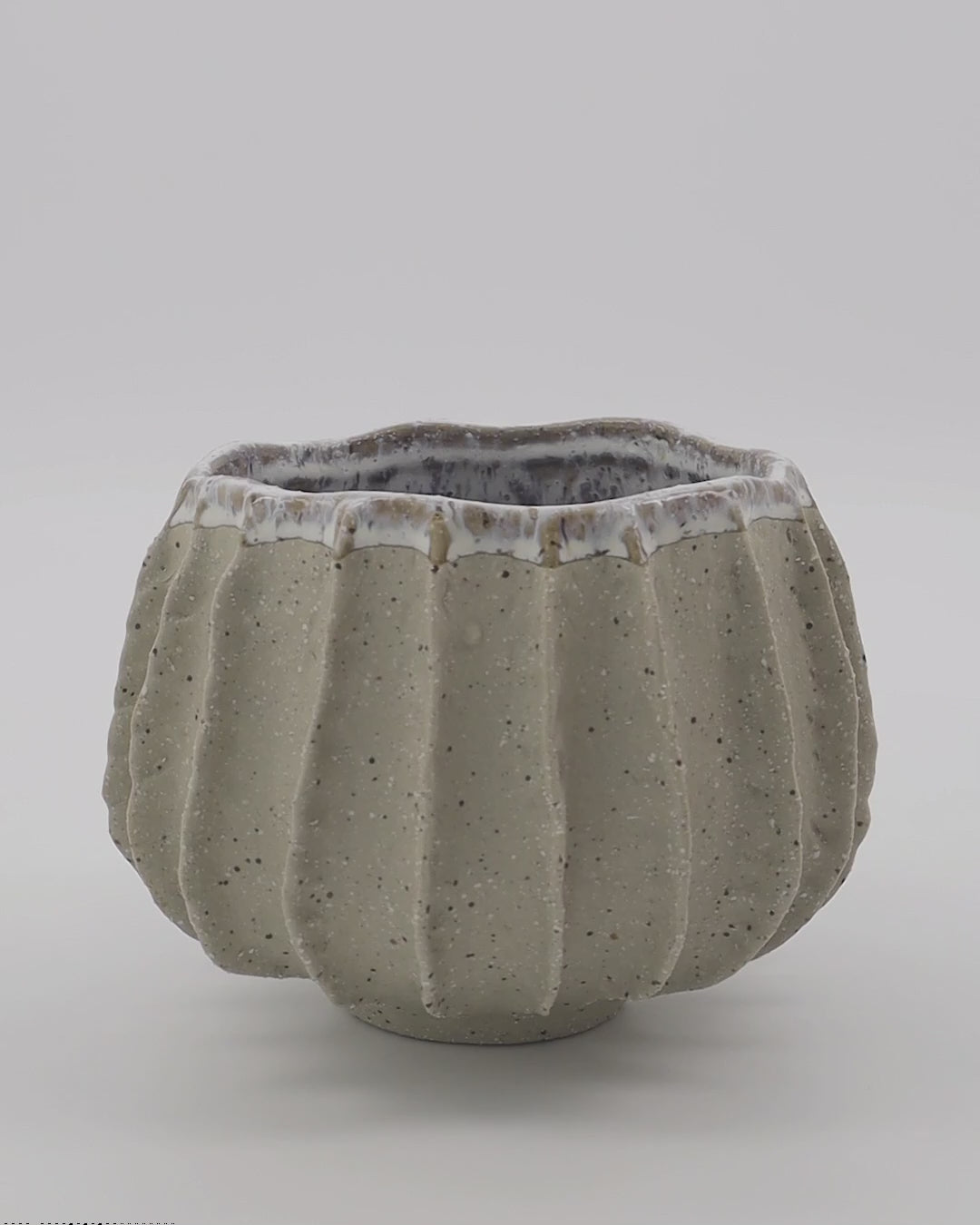 Verleihe deiner Wohnkultur mit diesem außerordentlichen Übertopf aus Steinzeug eine persönliche Note. Das einzigartige, geriffelte Design und die gesprenkelte Beige/Grau-Optik machen ihn zu einem echten Hingucker – ob alleinstehend oder kombiniert mit einer Pflanze.